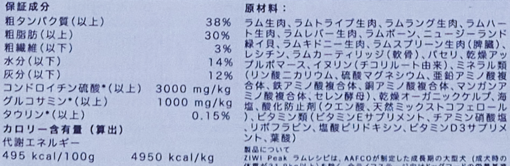 ラム生肉、ラムトライプ生肉、ラムラング生肉、ラムハート生肉、ラムレバー生肉、ラムボーン、ニュージーランド緑イ貝、ラムキドニー生肉、ラムスプリーン生肉(脾臓)、レシチン、ラムカーティリッジ(軟骨)、パセリ、乾燥アップルポマース、イヌリン(チコリルート由来)、ミネラル類(リン酸二カリウム、硫酸マグネシウム、亜鉛アミノ酸複合体、鉄アミノ酸複合体、銅アミノ酸複合体、マンガンアミノ酸複合体、セレン酵母)、乾燥オーガニックケルプ、海塩、酸化防止剤(クエン酸、天然ミックストコフェロール)、ビタミン類(ビタミンEサプリメント、チアミン硝酸塩、リボフラビン、塩酸ピリドキシン、ビタミンD3サプリメント、葉酸)
