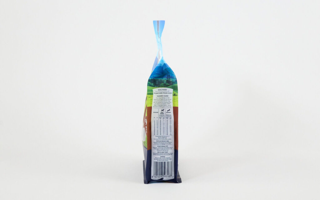 側面にも目安となる給餌量が記載されています。運動量の違いにより食事量に差が出てくるので、愛犬の行動をしっかりと観察し、適切な量を与えてあげましょう。