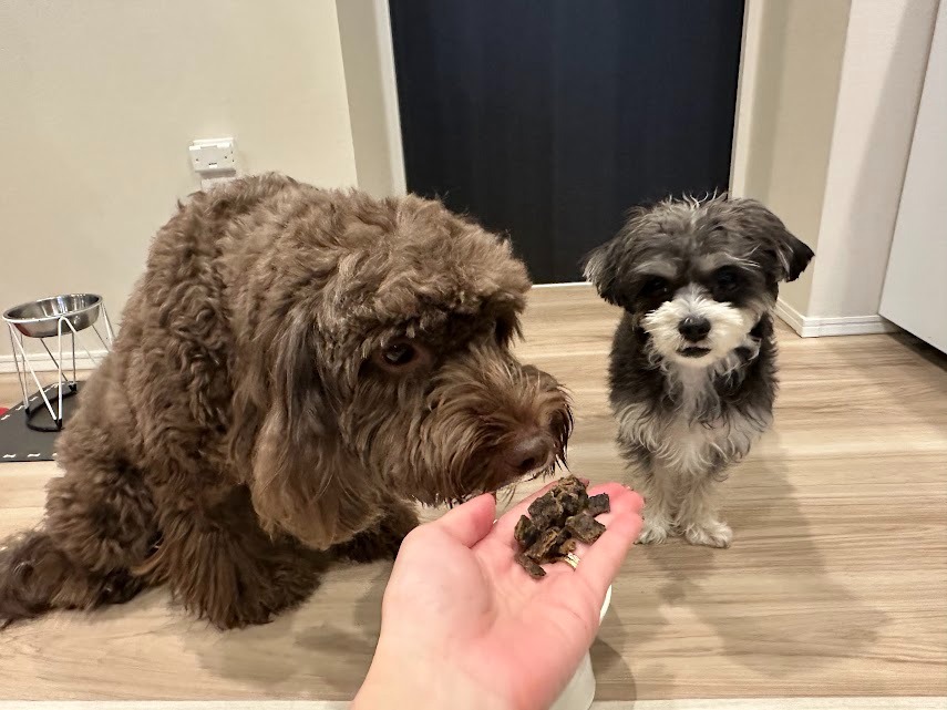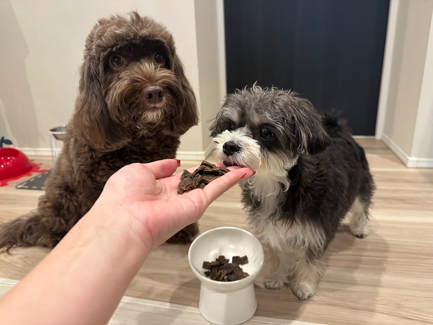 わが家の愛犬たち、子犬のシュナウザー×マルチーズ(小型犬)と成犬のプードル×イングリッシュスプリンガー(中型犬)に「ジウィピーク エアドライ・ドッグフード ビーフ」を与えてみました。しっかりとした噛みごたえがあり、美味しいものだと香りで分かっている2匹は、目を輝かせながら待っています。