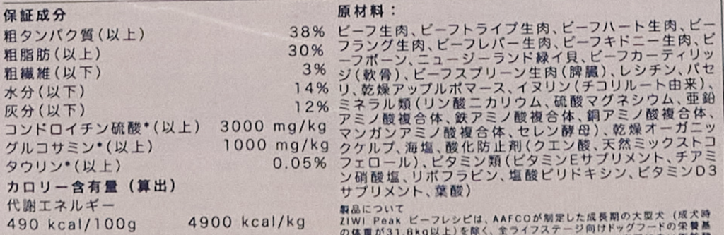 ビーフ生肉、ビーフトライプ生肉、ビーフハート生肉、ビーフラング生肉、ビーフレバー生肉、ビーフキドニー生肉、ビーフボーン、ニュージーランド緑イ貝、ビーフカーティリッジ(軟骨)、ビーフスプリーン生肉(脾臓)、レシチン、パセリ、乾燥アップルポマース、イヌリン(チコリルート由来)、ミネラル類(リン酸二カリウム、硫酸マグネシウム、亜鉛アミノ酸複合体、鉄アミノ酸複合体、銅アミノ酸複合体、マンガンアミノ酸複合体、セレン酵母)、乾燥オーガニックケルプ、海塩、酸化防止剤(クエン酸、天然ミックストコフェロール)、ビタミン類(ビタミンEサプリメント、チアミン硝酸塩、リボフラビン、塩酸ピリドキシン、ビタミンD3サプリメント、葉酸)