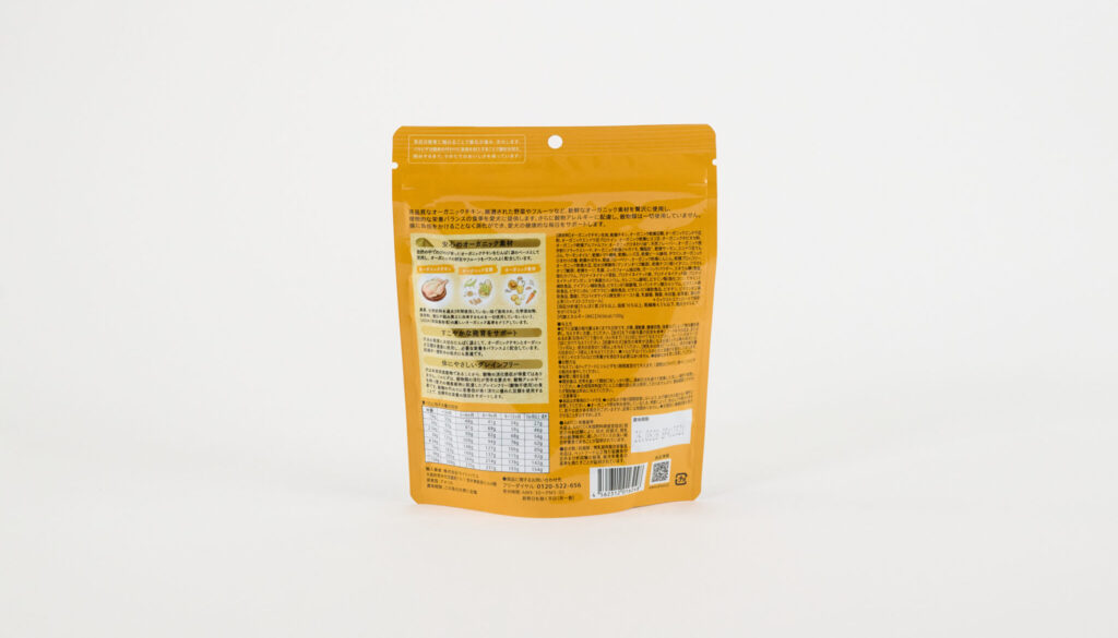 パッケージ裏面には使用されているオーガニック食材や原材料、1日の給餌量の目安など、必要な情報がしっかり記載されています。また、パッケージに明記されている通り「ソルビダ グレインフリー チキン 子犬用」はグレインフリー設計となっているため、穀物アレルギーの子でも安心です。
