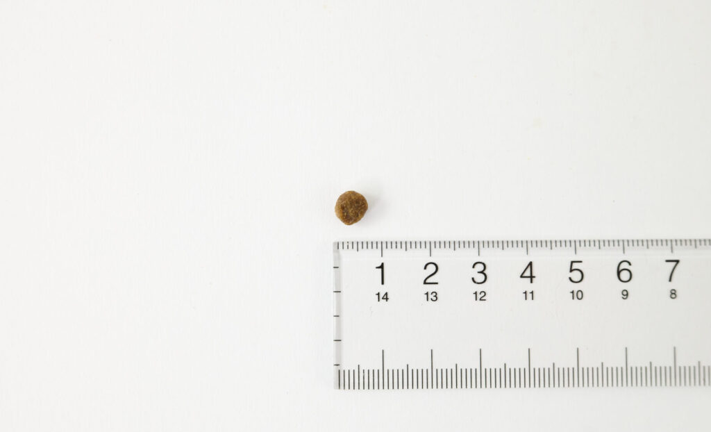 粒の大きさは約0.7~0.8mmほどです。子犬に特化したフードなので粒が小さめに設計されていますが、中には小さすぎて食べにくさを感じてしまう子もいます。丸飲みしてしまわないよう、食事の際は注意深く見守ってあげましょう。