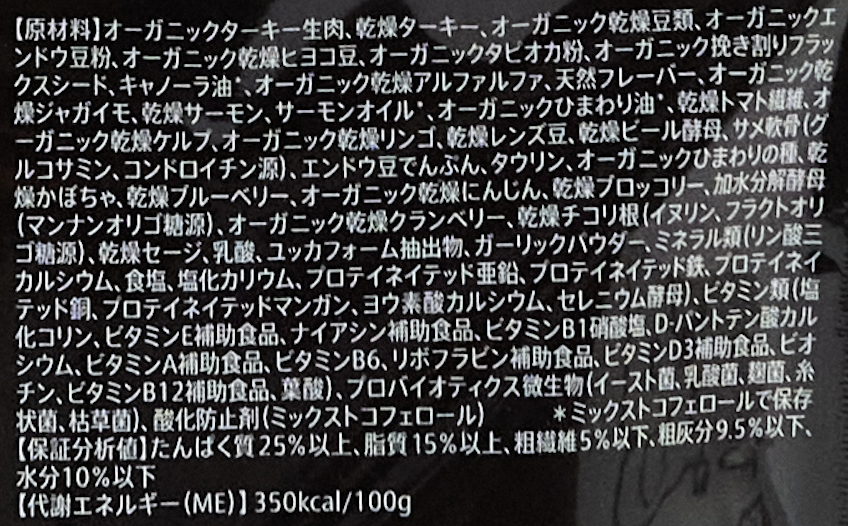 オーガニックターキー生肉、乾燥ターキー、オーガニック乾燥豆類、オーガニックエンドウ豆粉、オーガニック乾燥ヒヨコ豆、オーガニックタピオカ粉、オーガニック挽き割りフラックスシード、キャノーラ油*、オーガニック乾燥アルファルファ、天然フレーバー、オーガニック乾燥ジャガイモ、乾燥サーモン、サーモンオイル*、オーガニックひまわり油*、乾燥トマト繊維、オーガニック乾燥ケルプ、オーガニック乾燥リンゴ、乾燥レンズ豆、乾燥ビール酵母、サメ軟骨(グルコサミン、コンドロイチン源)、エンドウ豆でんぷん、タウリン、オーガニックひまわりの種、乾燥かぼちゃ、乾燥ブルーベリー、オーガニック乾燥にんじん、乾燥ブロッコリー、加水分解酵母(マンナンオリゴ糖源)、オーガニック乾燥クランベリー、乾燥チコリ根(イヌリン、フラクトオリゴ糖源)、乾燥セージ、乳酸、ユッカフォーム抽出物、ガーリックパウダー、ミネラル類(リン酸三カルシウム、食塩、塩化カリウム、プロテイネイテッド亜鉛、プロテイネイテッド鉄、プロテイネイテッド銅、プロテイネイテッドマンガン、ヨウ素酸カルシウム、セレニウム酵母)、ビタミン類(塩化コリン、ビタミンE補助食品、ナイアシン補助食品、ビタミンB1硝酸塩、D-パントテン酸カルシウム、ビタミンA補助食品、ビタミンB6、リボフラビン補助食品、ビタミンD3補助食品、ビオチン、ビタミンB12補助食品、葉酸)、プロバイオティクス微生物(イースト菌、乳酸菌、麹菌、糸状菌、枯草菌)、酸化防止剤(ミックストコフェロール) *ミックストコフェロールで保存