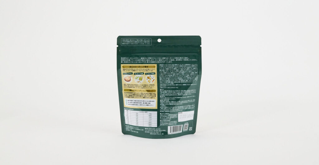 パッケージ裏面には、ソルビダのフードとして最大の特徴となるオーガニック素材についての記載があります。主原料となるチキンだけではなく、ひまわり油や挽き割りフラックスシード、豆類など様々なオーガニック素材を含んでおり、自然派の食材にこだわりたい飼い主さんにもおすすめです。