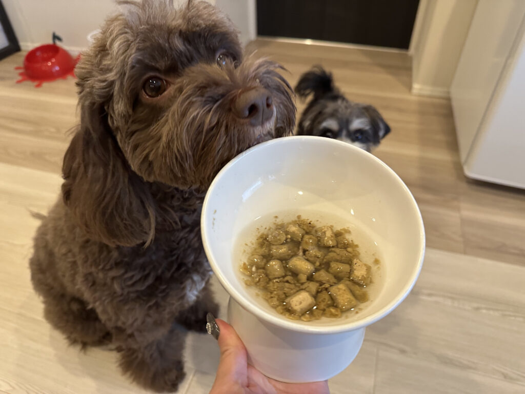 食いつきもいつも以上の勢いで、美味しさがよく伝わりました。そのままふやかすとやや大きさもあるので、小型犬などには手で潰したりして砕いて与えるのが安心です。消化吸収に優れたフードのため、便の状態も安定し、量は少なめで締まりのある便になりました。