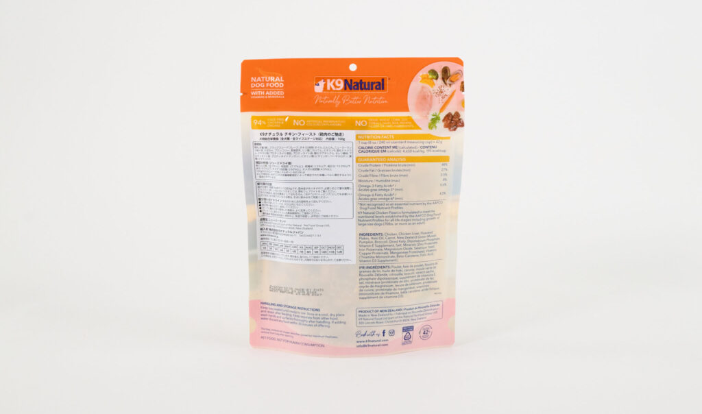 「K9 チキン・フィースト」は、パッケージ裏面に原材料をしっかりと明記しています。ニュージーランド産の原材料を使用し、同国の厳しい畜産基準に沿って生産されており、食用基準を満たした原材料を使用しています。