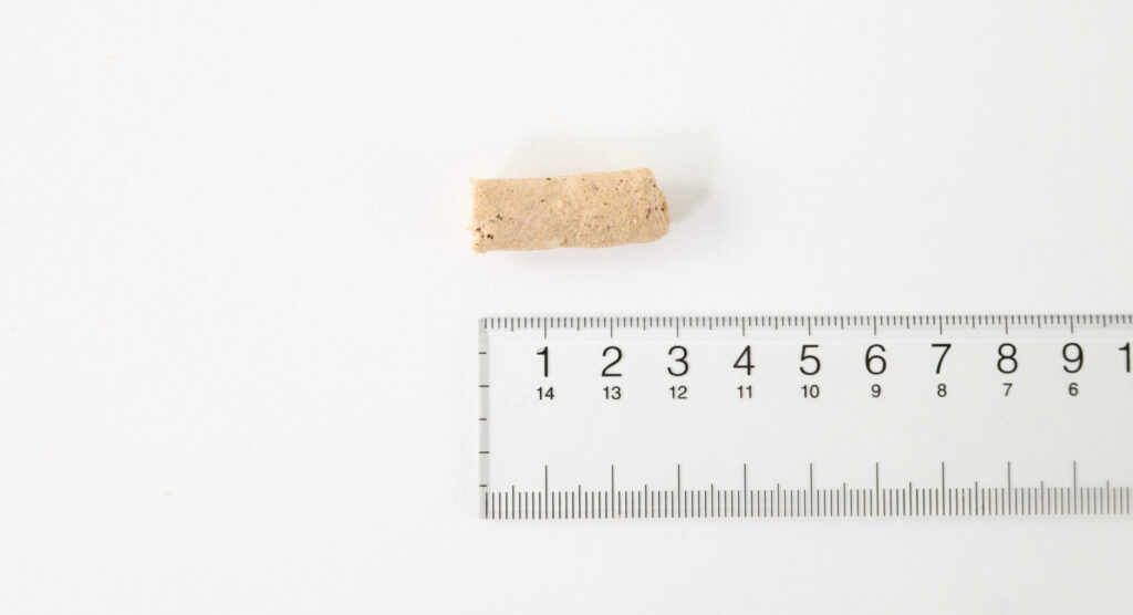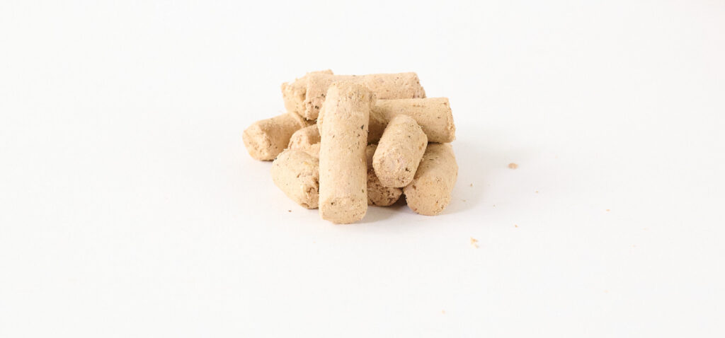フードは細長い形状で、穀類や豆類などのつなぎを一切使用していません。そのため、製造ロットによって形が崩れているものもありますが、性質そのものに問題はないため安心して与えられます。