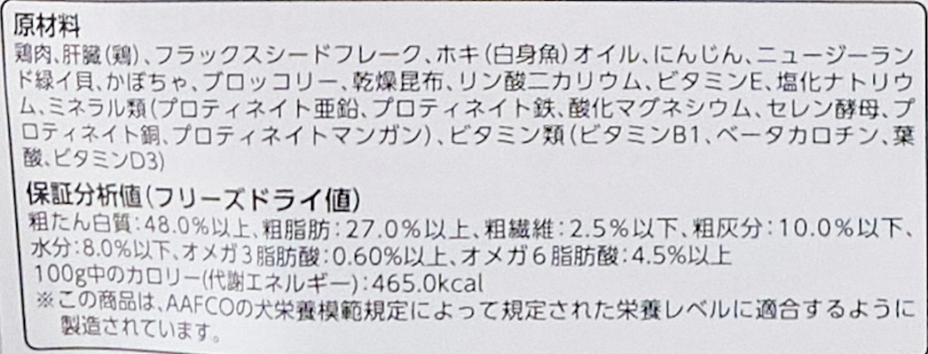 鶏肉、肝臓(鶏)、フラックスシードフレーク、ホキ(白身魚)オイル、にんじん、ニュージーランド緑イ貝、かぼちゃ、ブロッコリー、乾燥昆布、リン酸二カリウム、ビタミンE、塩化ナトリウム、ミネラル類(プロティネイト亜鉛、プロティネイト鉄、酸化マグネシウム、セレン酵母、プロティネイト銅、プロティネイトマンガン)、ビタミン類(ビタミンB1、ベータカロチン、葉酸、ビタミンD3)