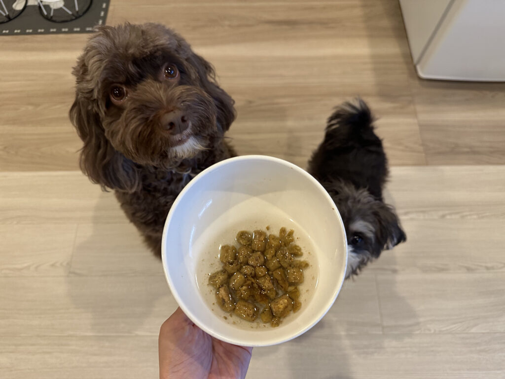 食事として与える際はぬるま湯で戻してから与えましたが、戻した瞬間に香りが一段と立ち、食欲をそそる濃厚なビーフの香りに。準備中から愛犬たちの目が輝き、待ちきれない様子がはっきり伝わってきます。実際に食べ始めると食いつきは想像以上で、あっという間に完食。満足度の高さがよく分かる反応でした。