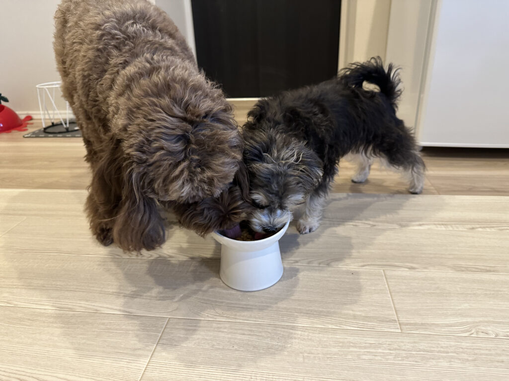 わが家の愛犬たち、子犬のシュナウザー×マルチーズ(小型犬)と成犬のプードル×イングリッシュスプリンガー(中型犬)に「K9 ビーフ&ホキ(白身魚)・フィースト」を与えてみました。
