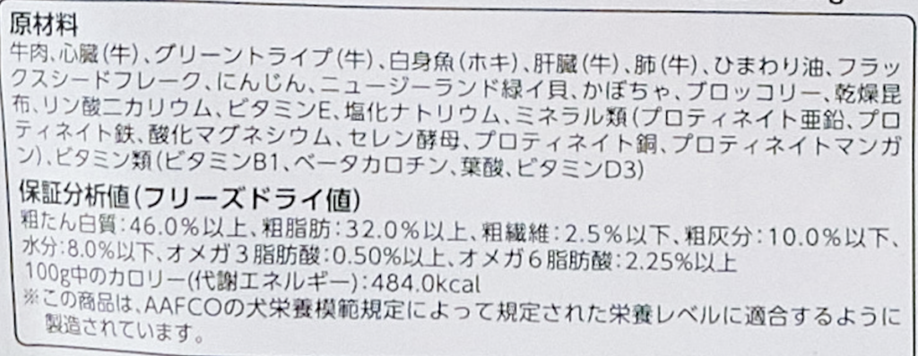 牛肉、心臓(牛)、グリーントライプ(牛)、白身魚(ホキ)、肝臓(牛)、肺(牛)、ひまわり油、フラックスシードフレーク、にんじん、ニュージーランド緑イ貝、かぼちゃ、ブロッコリー、乾燥昆布、リン酸二カリウム、ビタミンE、塩化ナトリウム、ミネラル類(プロティネイト亜鉛、プロティネイト鉄、酸化マグネシウム、セレン酵母、プロティネイト銅、プロティネイトマンガン)、ビタミン類(ビタミンB1、ベータカロチン、葉酸、ビタミンD3)