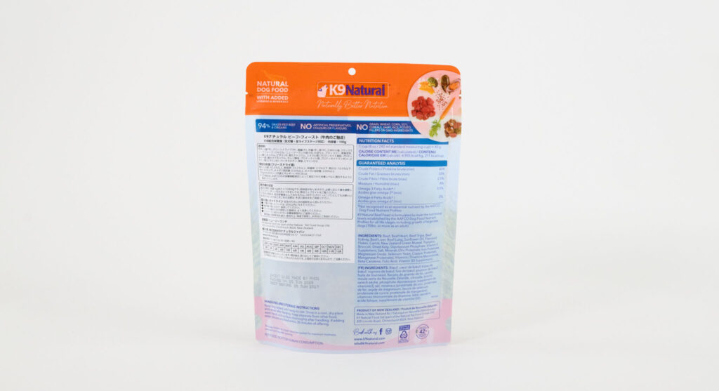 「K9 ビーフ・フィースト」は、パッケージ裏面に原材料をしっかりと明記しています。ニュージーランド産の原材料を使用し、同国の畜産基準に沿って生産。食用基準を満たした原材料を使用しています。