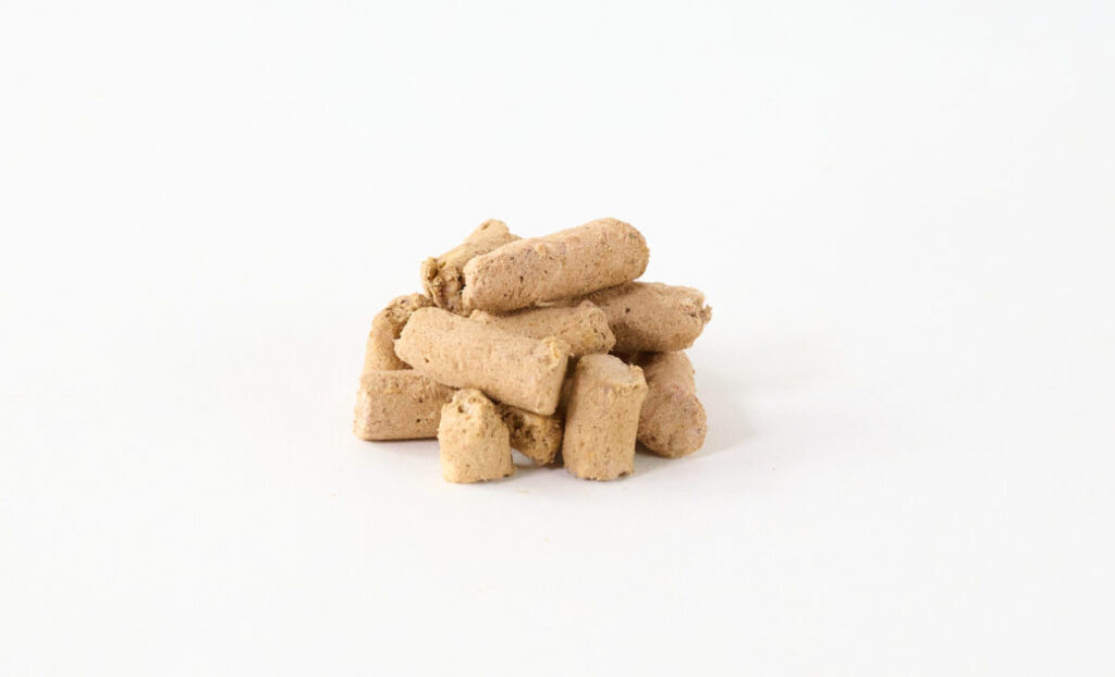 粒は大きめの長い形状をしていますが、焼き固めていないので簡単に崩れるほどの硬さです。独自改良したフリーズドライ製法で水分のみを抜いており、素材の持つ栄養素や旨味は壊さず残っているので、愛犬の食いつきも良くなります