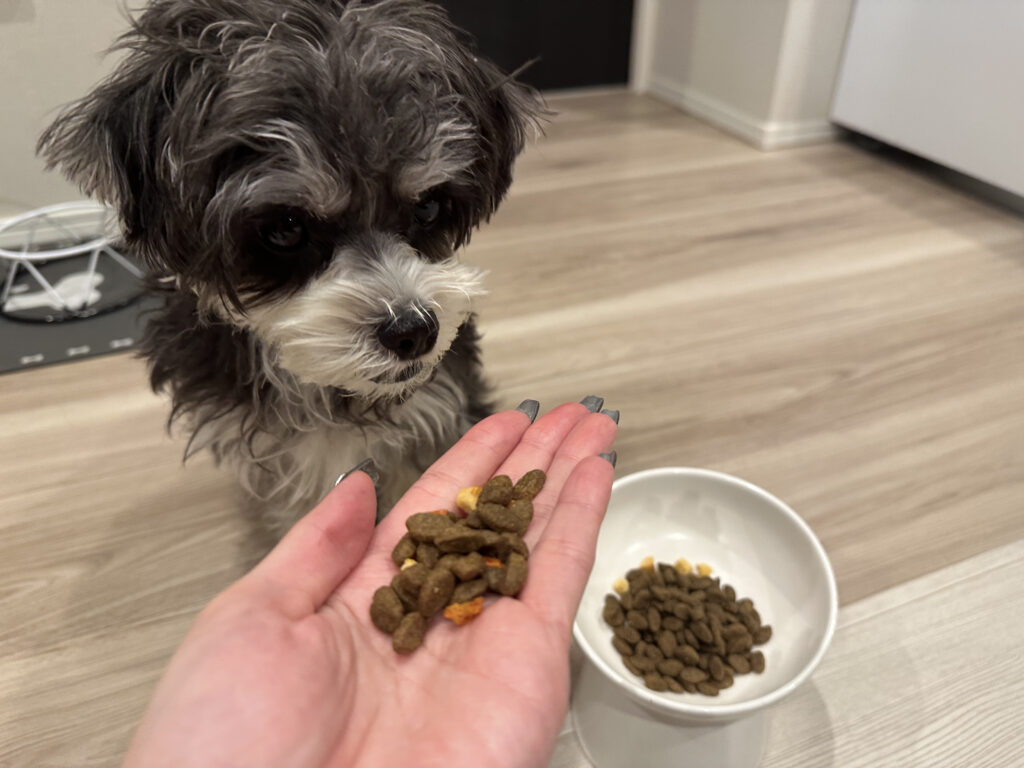 袋を開けた瞬間から興味を示し、食事前の反応はとても良好。成犬の小型犬でも噛みやすく、丸呑みしにくいサイズ感なので、しっかり噛んで食べられます。ラム特有の香りが粒にしっかり残っているため、噛むたびに香りが立ち、食欲を刺激している印象でした。