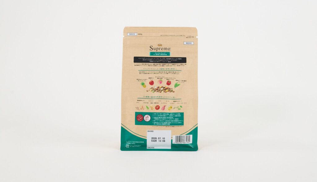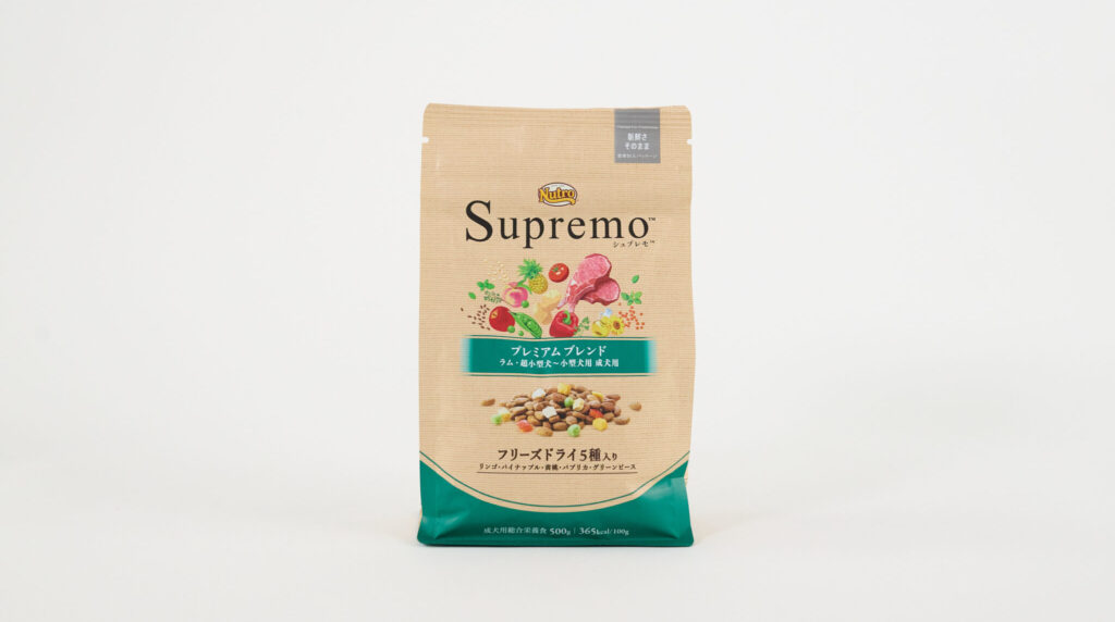 「シュプレモ プレミアム ブレンド ラム」はラム肉を第一主原料とし、18種類以上の自然素材(果物・野菜のフリーズドライ入り)をバランスよく配合した総合栄養食です。基本性能としての栄養バランスと嗜好性の高さはしっかりしています。