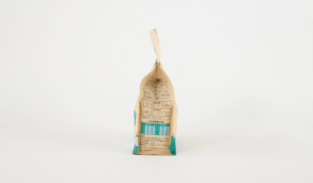 パッケージ裏面には、ビタミンEが豊富な黄桃、植物性たんぱく質が豊富なグリーンピースなど、フリーズドライそれぞれの特徴が記されています。そのほか、13種類の厳選された自然素材、穀物フリーであることなどがしっかり記載されているので、ぜひチェックしてみてください。