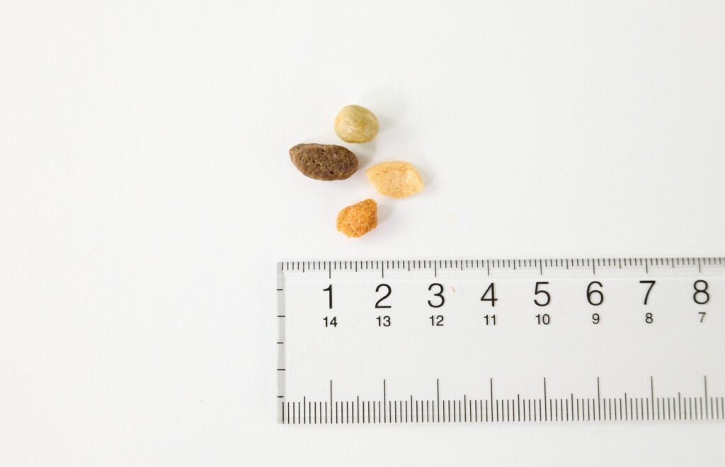 粒は約1cm~1.5cmほどで、超小型犬や小型犬にちょうどいいサイズ感です。「シュプレモ プレミアム ブレンド ラム」は自然素材を使用しており、粒の大きさや色、形などにばらつきが生じることがあります。それは収穫時期や産地によるもので、品質に問題はないので安心です。