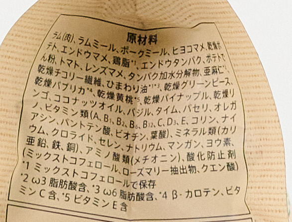 ラム(肉)、ラムミール、ポークミール、ヒヨコマメ、乾燥ポテト、エンドウマメ、鶏脂*1、エンドウタンパク、ポテトでん粉、トマト、レンズマメ、タンパク加水分解物、亜麻仁*2、乾燥チコリー繊維、ひまわり油*1*3、乾燥グリーンピース、乾燥パプリカ*4、乾燥黄桃*5、乾燥パイナップル、乾燥リンゴ、ココナッツオイル、バジル、タイム、パセリ、オレガノ、ビタミン類(A、B1、B2、B6、B12、C、D3、E、コリン、ナイアシン、パントテン酸、ビオチン、葉酸)、ミネラル類(カリウム、クロライド、セレン、ナトリウム、マンガン、ヨウ素、亜鉛、鉄、銅)、アミノ酸類(メチオニン)、酸化防止剤(ミックストコフェロール、ローズマリー抽出物、クエン酸) *1 ミックストコフェロールで保存 *2 ω3脂肪酸含、*3 ω6脂肪酸含、*4 β-カロテン、ビタミンC含、*5 ビタミンE含