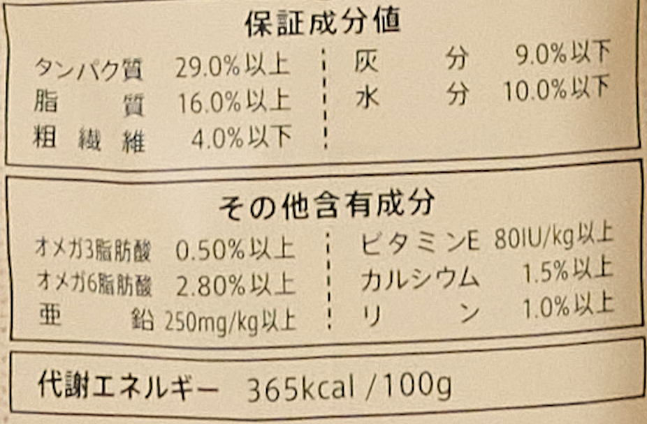 | たんぱく質 | 29.0%以上 | 脂質 | 16.0%以上 |