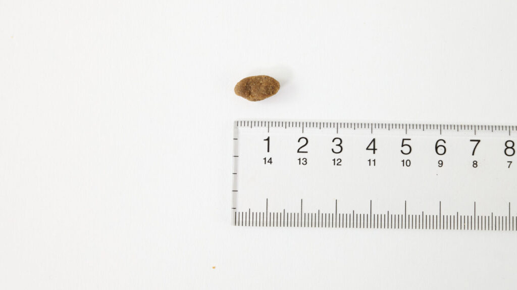 粒の大きさは約1.3cmほどです。自然食材を使用しているので粒にばらつきが生じることがありますが、それは原材料の産地や収穫時期によるもののため、品質には特に問題ありません。そのため、多少サイズ感や色、形が異なるものがあっても、安心して与えられます。