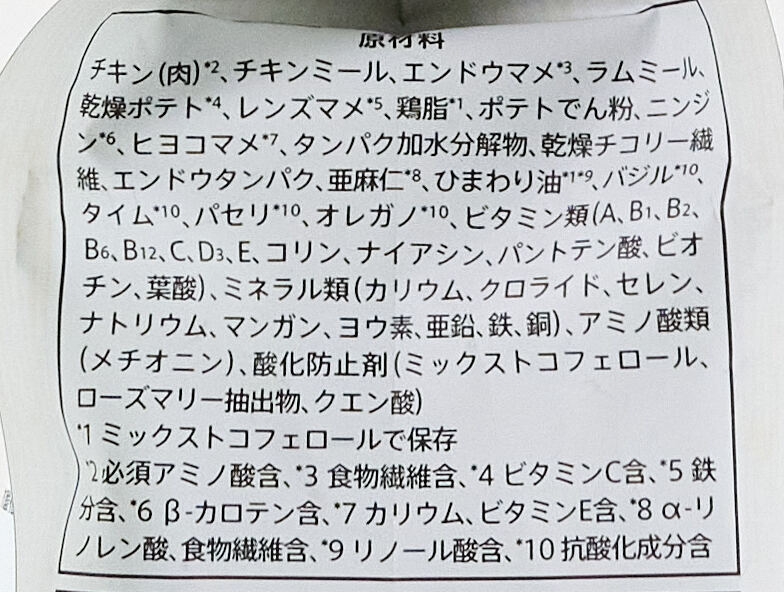 チキン(肉)*2、チキンミール、エンドウマメ*3、ラムミール、乾燥ポテト*4、レンズマメ*5、鶏脂*1、ポテトでん粉、ニンジン*6、ヒヨコマメ*7、タンパク加水分解物、乾燥チコリー繊維、エンドウタンパク、亜麻仁*8、ひまわり油*1*9、バジル*10、タイム*10、パセリ*10、オレガノ*10、ビタミン類(A、B1、B2、B6、B12、C、D3、E、コリン、ナイアシン、パントテン酸、ビオチン、葉酸)、ミネラル類(カリウム、クロライド、セレン、ナトリウム、マンガン、ヨウ素、亜鉛、鉄、銅)、アミノ酸類(メチオニン)、酸化防止剤(ミックストコフェロール、ローズマリー抽出物、クエン酸) *1 ミックストコフェロールで保存 *2 必須アミノ酸含、*3 食物繊維含、*4 ビタミンC含、*5 鉄分含、*6 β-カロテン含、*7 カリウム、ビタミンE含、*8 α-リノレン酸、食物繊維含、*9 リノール酸含、*10 抗酸化成分含
