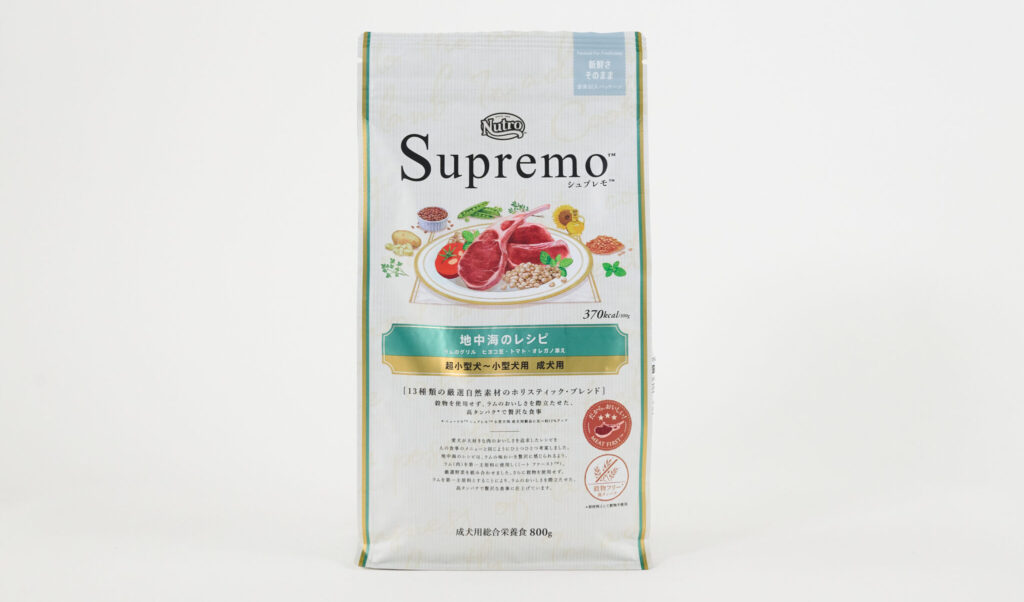 超小型犬から小型犬に特化した「シュプレモ 地中海のレシピ ラム」は、高品質なラムを主原料にし、トマトやオレガノなどの厳選した自然素材13種類をホリスティックにブレンドしたフードです。穀物不使用で、ポテトやひよこ豆などの消化性に優れた素材を含んでいます。