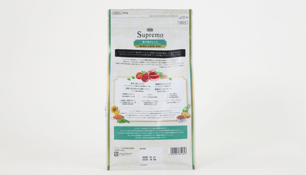 「シュプレモ 地中海のレシピ ラム」は、パッケージ側面に原材料が細かく記されています。オメガ3脂肪酸、ビタミンC・E、オメガ6脂肪酸などの栄養素がどの素材に入っているか分かりやすく記載されているのもポイントです。