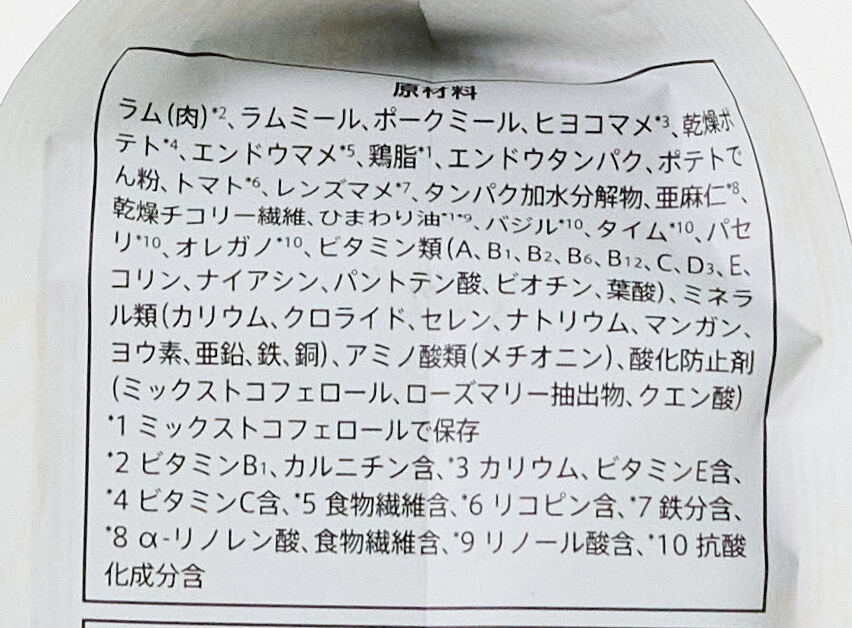 ラム(肉)*2、ラムミール、ポークミール、ヒヨコマメ*3、乾燥ポテト*4、エンドウマメ*5、鶏脂*1、エンドウタンパク、ポテトでん粉、トマト*6、レンズマメ*7、タンパク加水分解物、亜麻仁*8、乾燥チコリー繊維、ひまわり油*1*9、バジル*10、タイム*10、パセリ*10、オレガノ*10、ビタミン類(A、B1、B2、B6、B12、C、D3、E、コリン、ナイアシン、パントテン酸、ビオチン、葉酸)、ミネラル類(カリウム、クロライド、セレン、ナトリウム、マンガン、ヨウ素、亜鉛、鉄、銅)、アミノ酸類(メチオニン)、酸化防止剤(ミックストコフェロール、ローズマリー抽出物、クエン酸) *1 ミックストコフェロールで保存 *2 ビタミンB1、カルニチン含、*3 カリウム、ビタミンE含、*4 ビタミンC含、*5 食物繊維含、*6 リコピン含、*7 鉄分含、*8 α-リノレン酸、食物繊維含、*9 リノール酸含、*10 抗酸化成分含