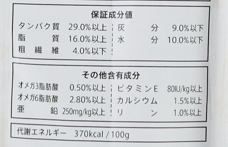 | たんぱく質 | 29.0%以上 | 脂質 | 16.0%以上 |