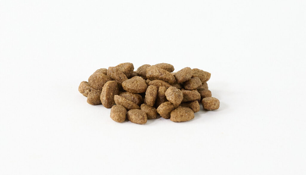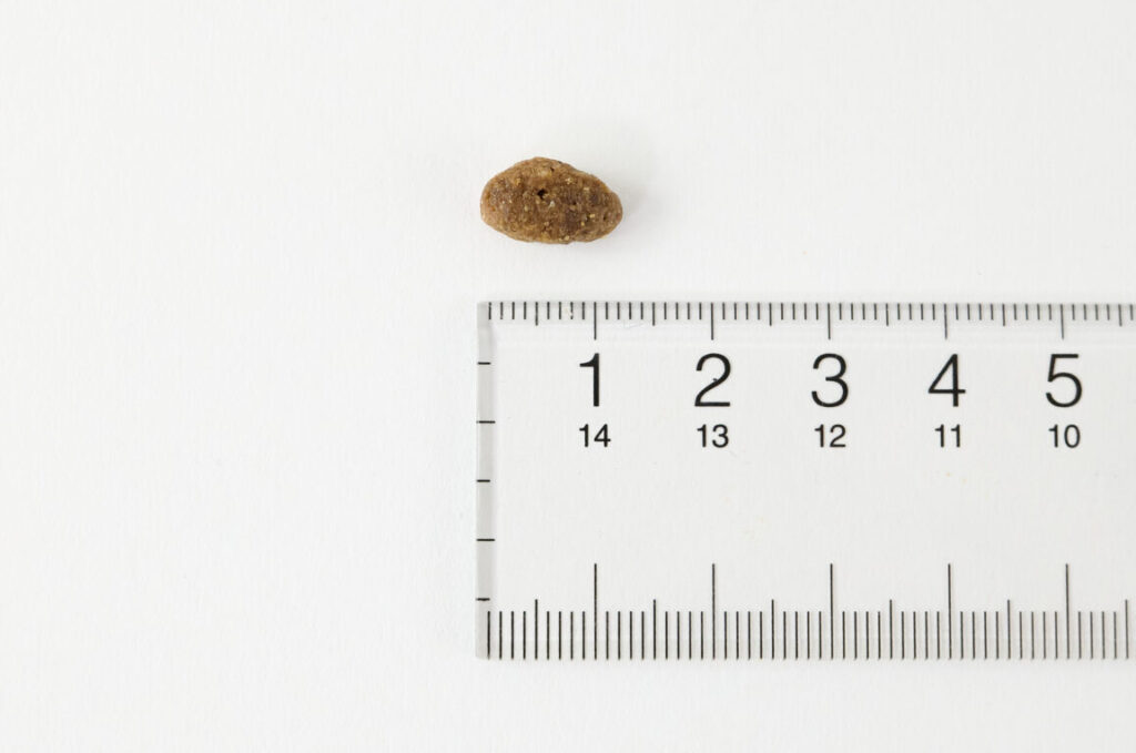 粒の大きさは約1.2cmほどの楕円形です。自然素材を使用しているので粒にばらつきが生じることがありますが、それは原材料の産地や収穫時期によるものなので、フード自体の品質には問題ありません。そのため、サイズ感や色、形など、多少異なるものがあっても、安心して与えられます。