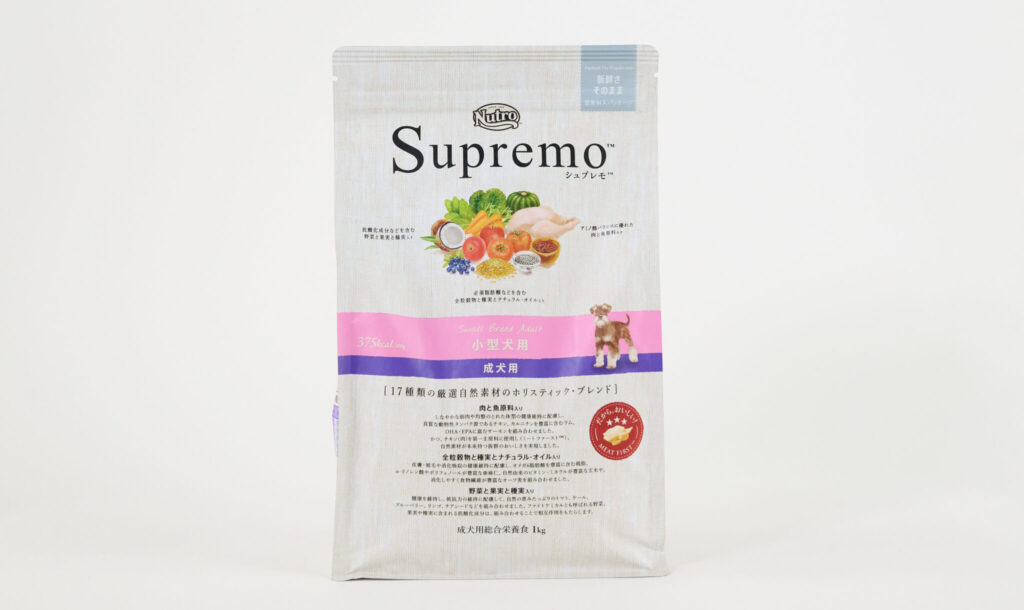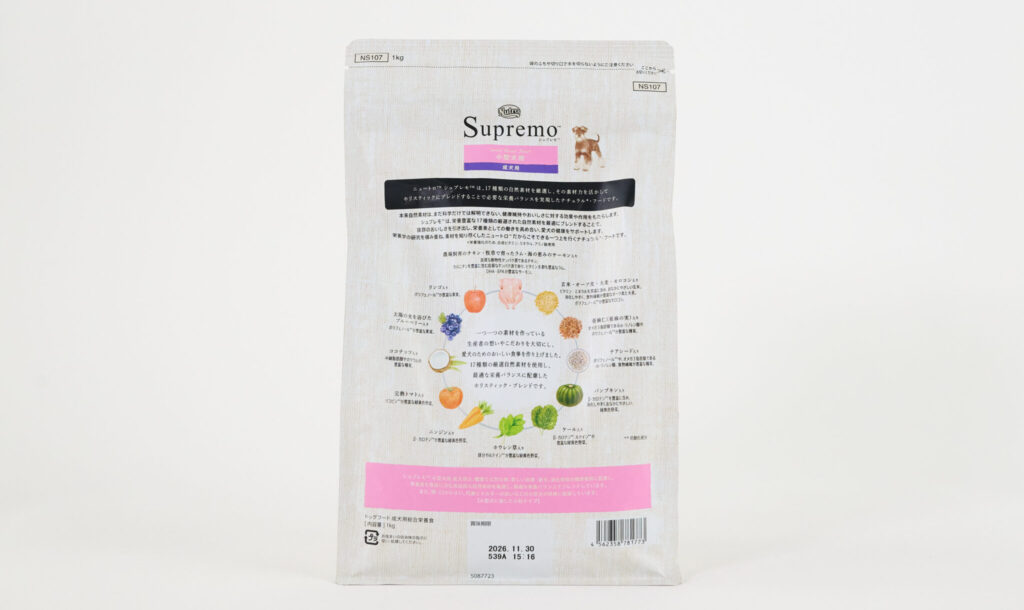 パッケージ表面にチキンや野菜、果物などのイラストが描かれている「シュプレモ 小型犬用」。17種類に厳選された素材がブレンドされています。ミート ファーストであることも明記されており、本来肉食である犬の食性に配慮したフードといえるでしょう。