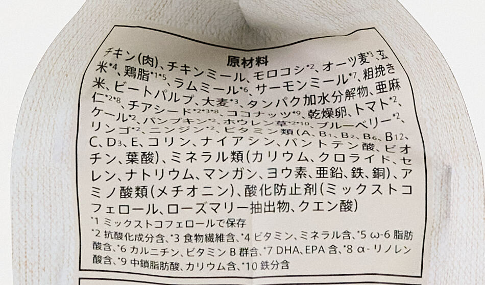 チキン(肉)、チキンミール、モロコシ*2、オーツ麦*3、玄米*4、鶏脂*1*5、ラムミール*6、サーモンミール*7、粗挽き米、ビートパルプ、大麦*3、タンパク加水分解物、亜麻仁*2*8、チアシード*2*3*8、ココナッツ*9、乾燥卵、トマト*2、ケール*2、パンプキン*2、ホウレン草*2*10、ブルーベリー*2、リンゴ*2、ニンジン*2、ビタミン類(A、B1、B2、B6、B12、C、D3、E、コリン、ナイアシン、パントテン酸、ビオチン、葉酸)、ミネラル類(カリウム、クロライド、セレン、ナトリウム、マンガン、ヨウ素、亜鉛、鉄、銅)、アミノ酸類(メチオニン)、酸化防止剤(ミックストコフェロール、ローズマリー抽出物、クエン酸) *1 ミックストコフェロールで保存 *2 抗酸化成分含、*3 食物繊維含、*4 ビタミン、ミネラル含、*5 ω-6脂肪酸含、*6 カルニチン、ビタミンB群含、*7 DHA、EPA含、*8 α-リノレン酸含、*9 中鎖脂肪酸、カリウム含、*10 鉄分含