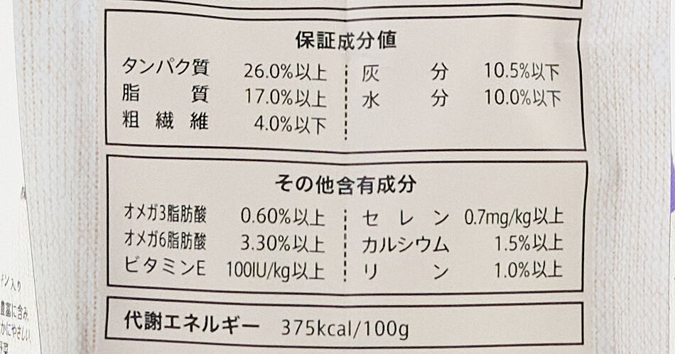 代謝エネルギーは375kcal/100gで高すぎることもなく、ドライフードとして標準的なエネルギー量です。健康な成犬、標準的な活動量の子に適していますが、運動量が少ない子やダイエット中の子の場合は、給餌量を調整して与えてあげましょう。