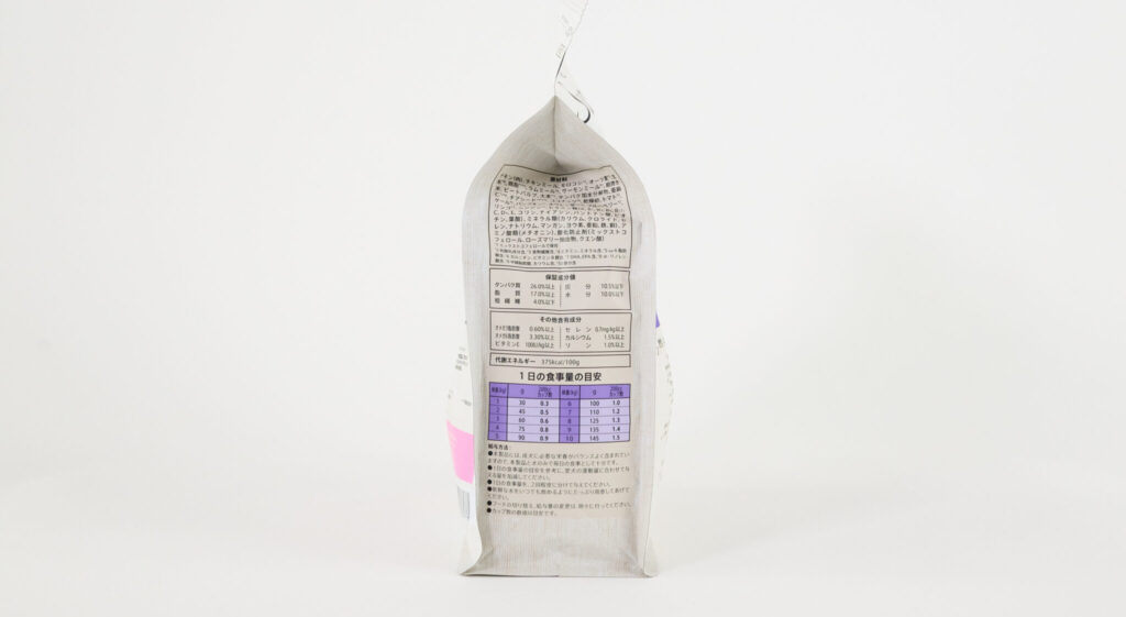 パッケージ側面には原材料や成分保証値が詳しく記載されています。使用されている原材料やカロリーなどをぜひチェックしてみてください。また、1日の食事量の目安や給与方法についても詳しく記されているので、愛犬の活動量や体調などを考慮しつつ、適切な量を正しく与えられるのもポイントです。