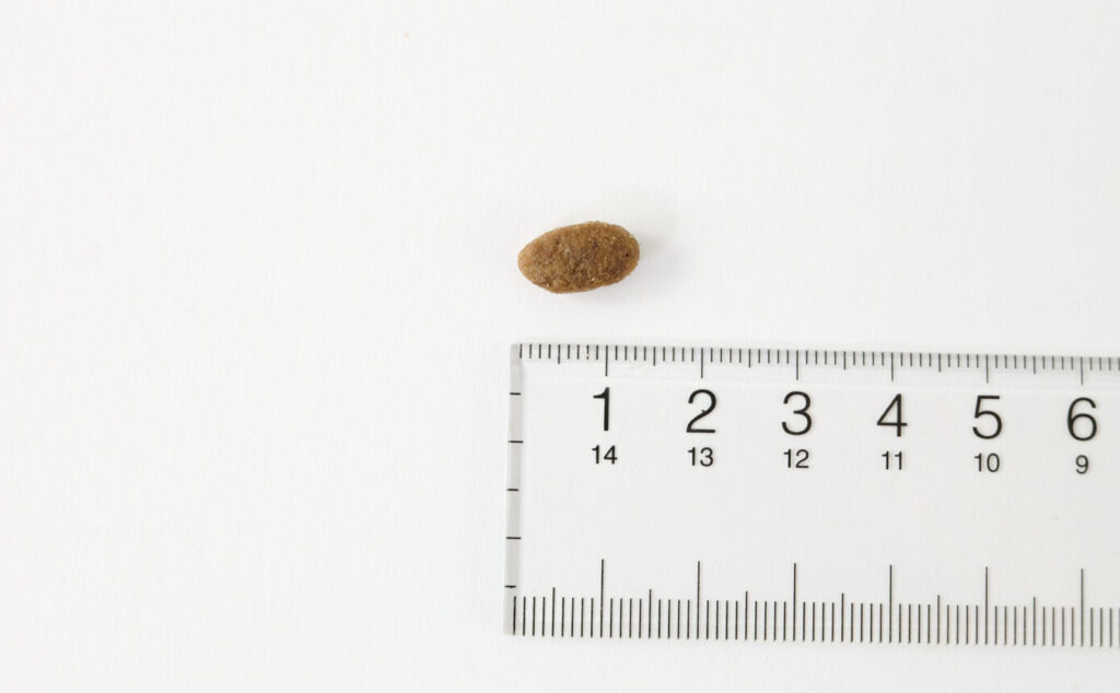 大きさはおよそ1.2cmほどの楕円形です。自然素材を使用しているので粒にばらつきが生じることがありますが、それは原材料の産地や収穫時期によるもののため、品質には特に問題ありません。そのため、多少サイズ感や色、形が異なるものがあっても、安心して与えられます。