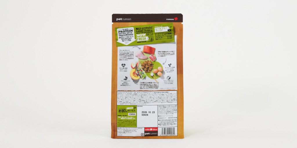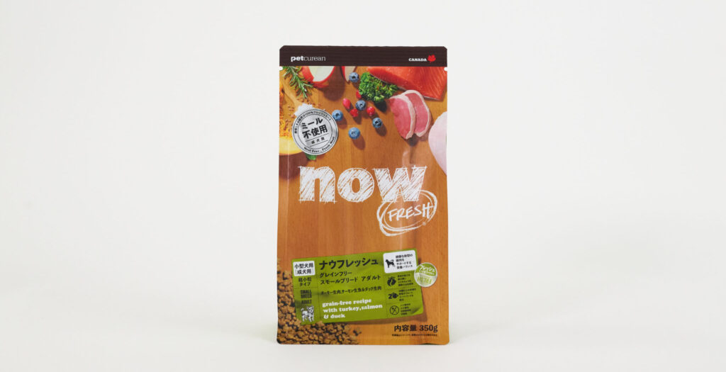 「ナウフレッシュ グレインフリー スモールブリード アダルト」は、パッケージに人工着色料・人工香料・合成保存料が不使用であるとしっかり明記されているので、添加物を避けたい飼い主さんにもおすすめです。また、ターキー生肉やサーモン生魚、ダック生肉を使い、ミールは不使用であることも記載されています。