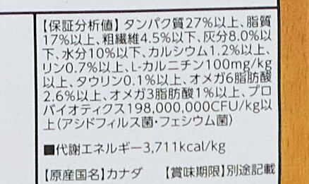 | たんぱく質 | 27%以上 | 脂質 | 17%以上 |