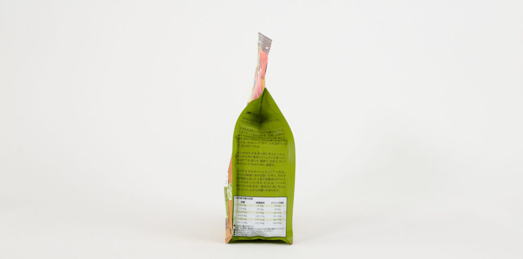 「ナウフレッシュ グレインフリー スモールブリード アダルト」のパッケージ側面には、愛犬に与える1日の給与量の目安が掲載されています。愛犬の年齢や体重、運動量などを考慮しつつ、目安を参考にすれば最適な量を与えられるのもポイントです。