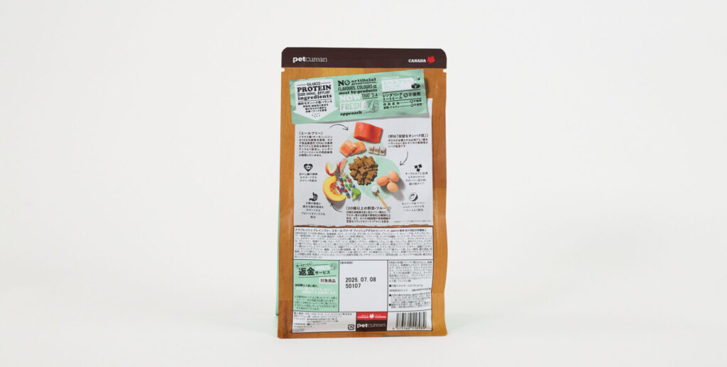 魚主体なので「チキンが合わない子」にとっては選択肢になりやすい印象。ただし注意点として、完全な単一たんぱくではありません。魚アレルギーがある子や、複数たんぱくに反応する体質の子は慎重に。「鶏・豚・牛肉不使用」と説明されていますが、乾燥鶏卵(卵)が配合されています(=卵アレルギーには注意)。小型犬には、特に体調の変化はなく体質との相性がハマれば安定しやすいタイプです。