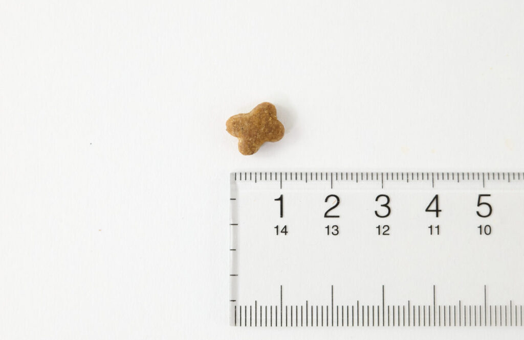 フードは約1cmほどの大きさです。クローバー型のデザインがかわいらしく、見た目も楽しめる設計。「ナウフレッシュ グレインフリー スモールブリード フィッシュアダルト」は自然素材を使用しているため、ロットにより粒の大きさや形などにばらつきが生じることもありますが、品質に問題はなく安心して与えられます。