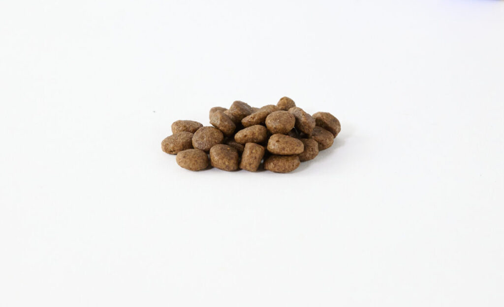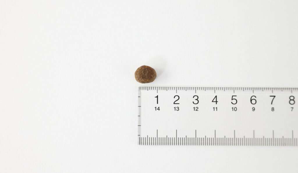 粒の大きさはおよそ1mmほどです。小型犬の場合、粒が少し大きめになるので、食べにくさがあれば小さく食べやすくして与えてあげましょう。