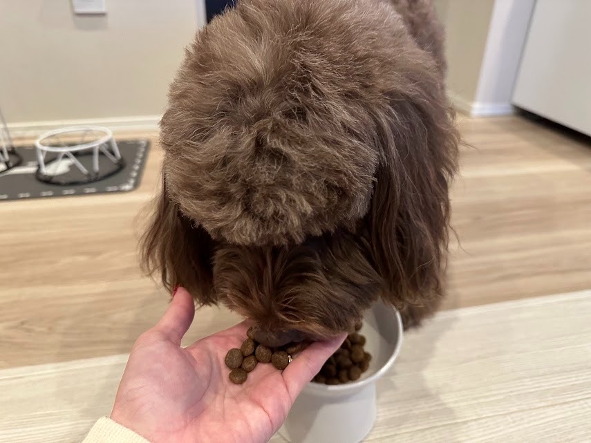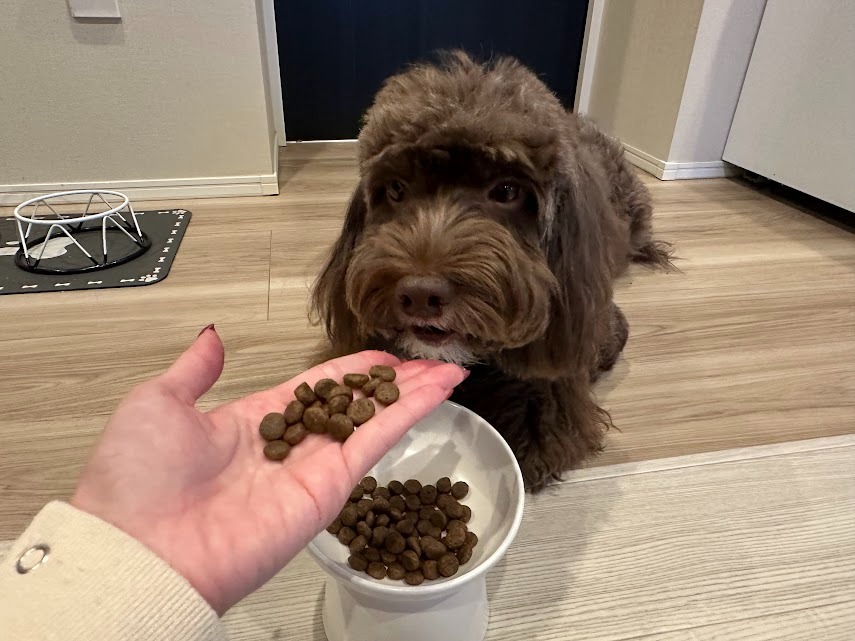 今回は私の愛犬、成犬のプードル×イングリッシュスプリンガー(中型犬)に実際に試してみました。実食の様子やフードの特徴などを詳しく紹介しますので、ぜひ参考にしてください。