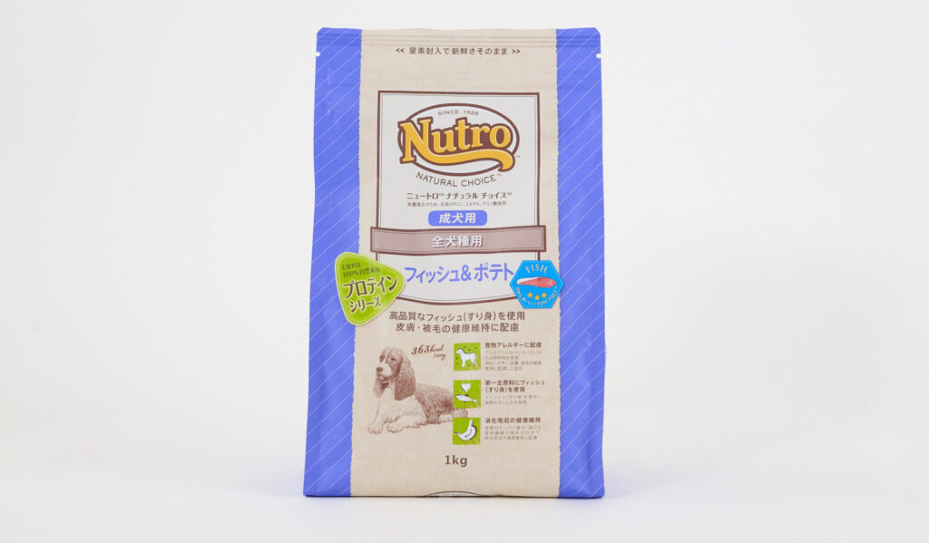 「ニュートロ ナチュラルチョイス フィッシュ&ポテト」は、アレルゲンをできるだけ避けることを目的としたフードで、主原料に魚たんぱくを使用し、一般的にアレルギー反応が出やすいとされる牛肉・鶏肉などの畜肉を使わない設計になっています。