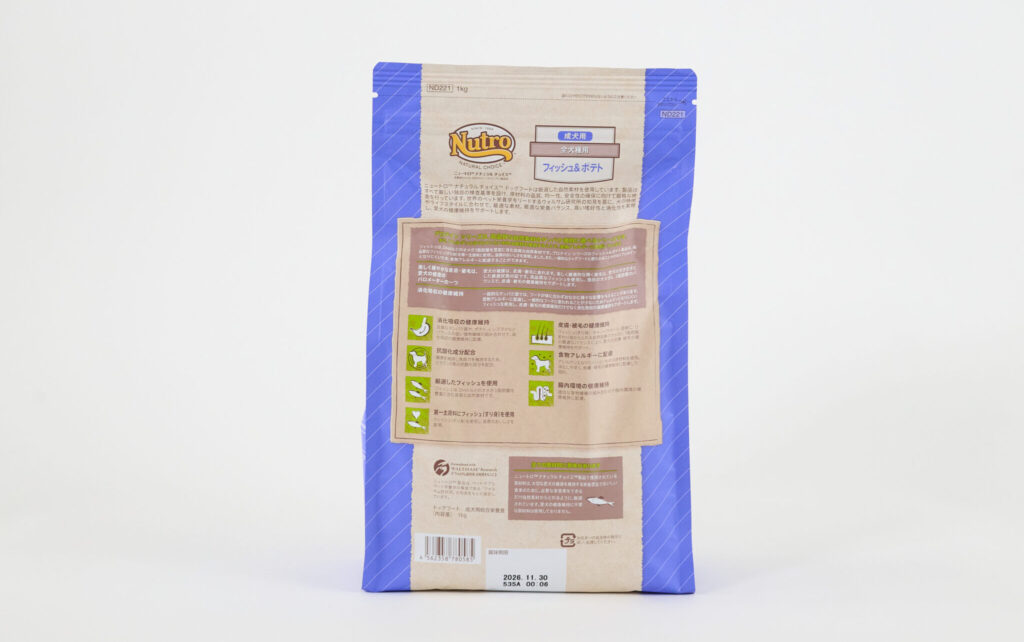 「ニュートロ ナチュラルチョイス フィッシュ&ポテト」は酸化防止に配慮された特殊なパッケージを採用しており、窒素を封入して袋詰めされます。酸素を窒素に置き換えることで油分の酸化や風味の劣化防止に効果的です。