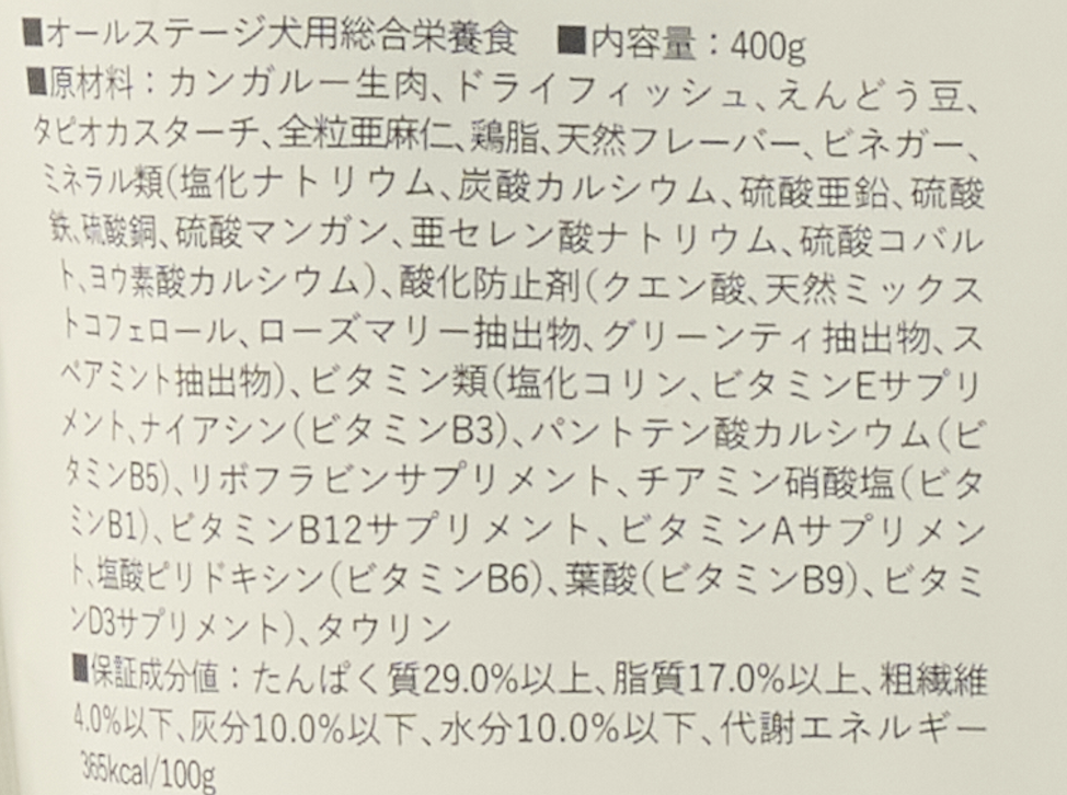 カンガルー生肉、ドライフィッシュ、えんどう豆、タピオカスターチ、全粒亜麻仁、鶏脂、天然フレーバー、ビネガー、ミネラル類(塩化ナトリウム、炭酸カルシウム、硫酸亜鉛、硫酸鉄、硫酸銅、硫酸マンガン、亜セレン酸ナトリウム、硫酸コバルト、ヨウ素酸カルシウム)、酸化防止剤(クエン酸、天然ミックストコフェロール、ローズマリー抽出物、グリーンティ抽出物、スペアミント抽出物)、ビタミン類(塩化コリン、ビタミンEサプリメント、ナイアシン(ビタミンB3)、パントテン酸カルシウム(ビタミンB5)、リボフラビンサプリメント、チアミン硝酸塩(ビタミンB1)、ビタミンB12サプリメント、ビタミンAサプリメント、塩酸ピリドキシン(ビタミンB6)、葉酸(ビタミンB9)、ビタミンD3サプリメント)、タウリン