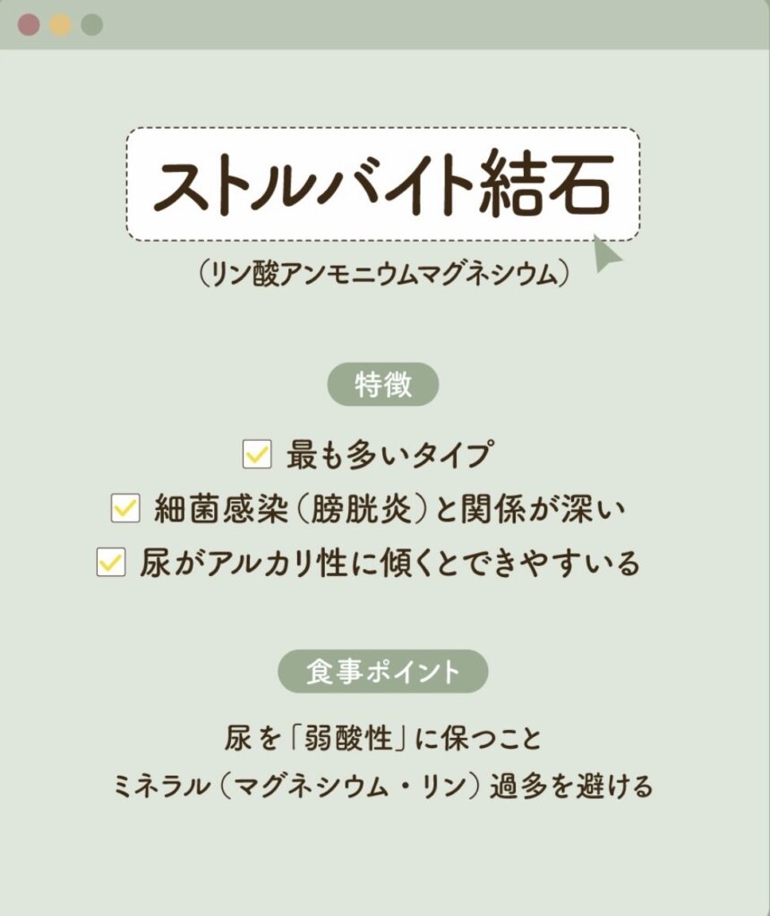 | 野菜中心の食事(過剰) | 尿がアルカリ性に傾きやすく、結石リスクにつながる可能性がある |