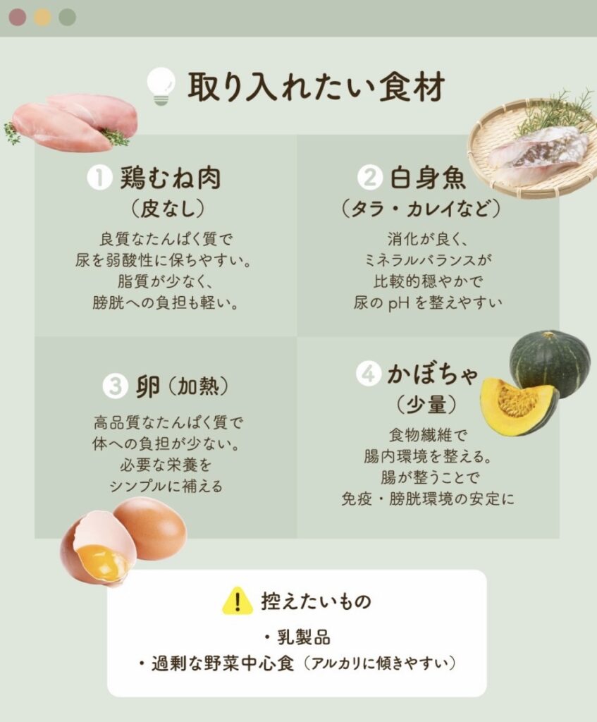 | 鶏むね肉(皮なし) | 良質なたんぱく質が豊富で、尿を弱酸性に保ちやすい。脂質が少なく膀胱への負担も軽い |
