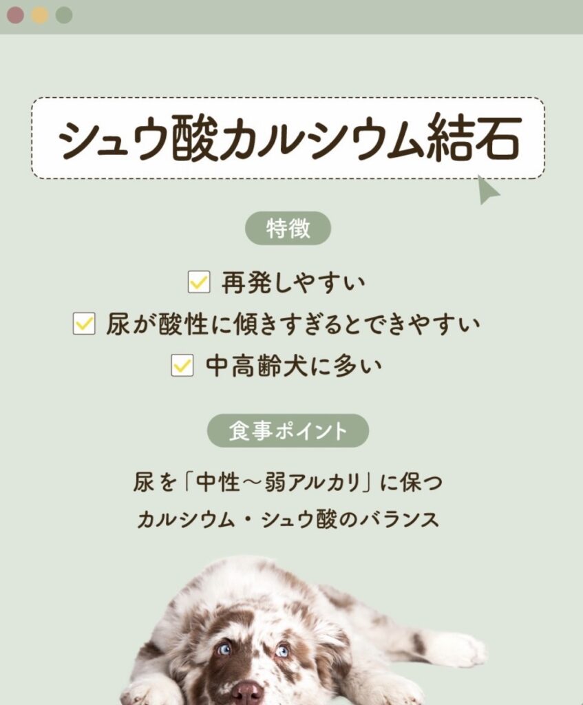 シュウ酸カルシウム結石は、一度できると溶けにくく、再発しやすいのが特徴です。中高齢の犬に多く、尿が酸性に傾きすぎることで発生リスクが高まります。
