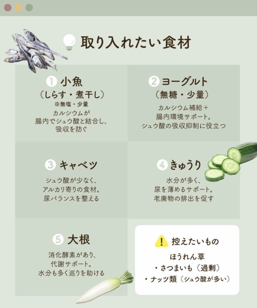 | ヨーグルト(無糖・少量) | カルシウム補給+腸内環境を整え、シュウ酸の吸収抑制に役立つ |