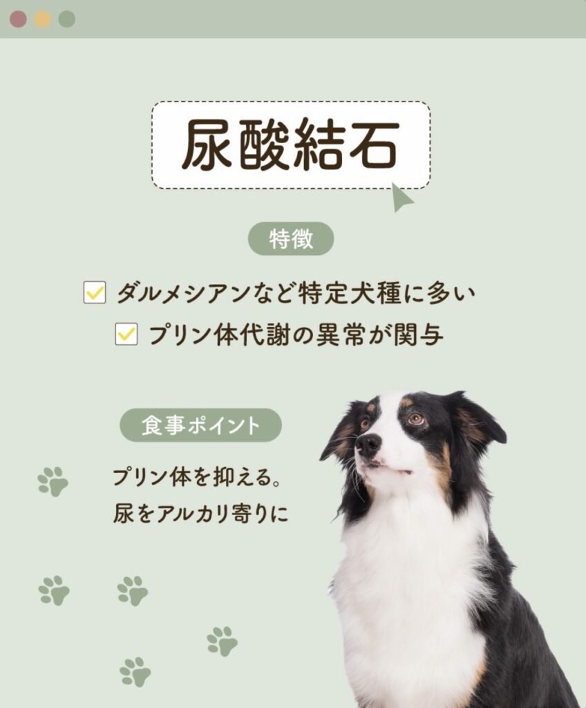 尿酸塩結石は、特定の犬種や代謝の異常によって発生することが多いです。タンパク質が分解される過程でできる「プリン体」が深く関わっており、尿が酸性になると結晶化が進みます。食事でのケアはプリン体の摂取量を抑えることが基本であり、尿をアルカリ寄りに保つ食材選びが鍵となります。